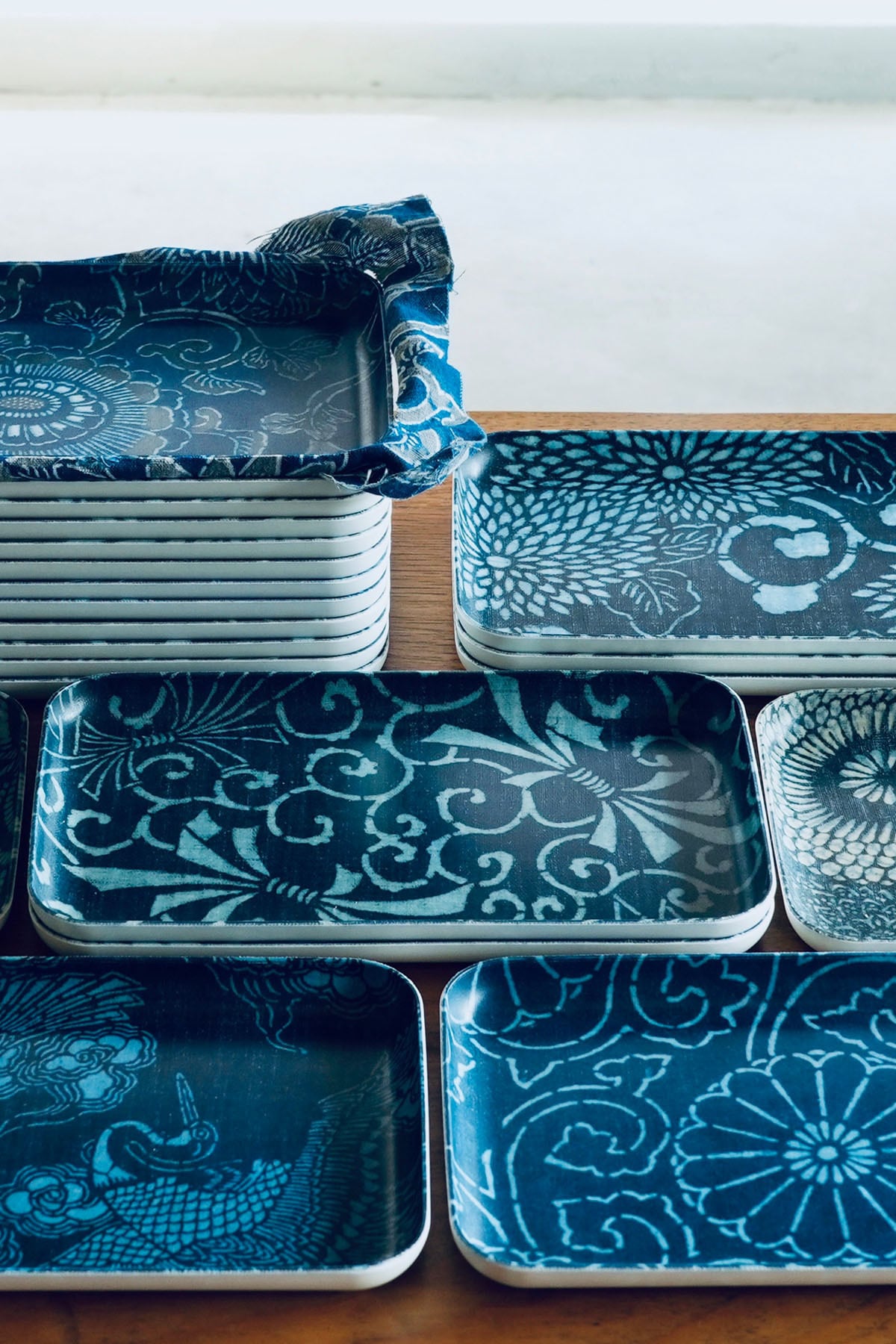 A tray with antique Japanese indigo-dyed fabric embedded.