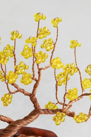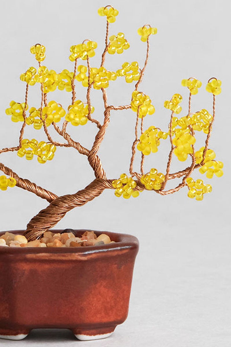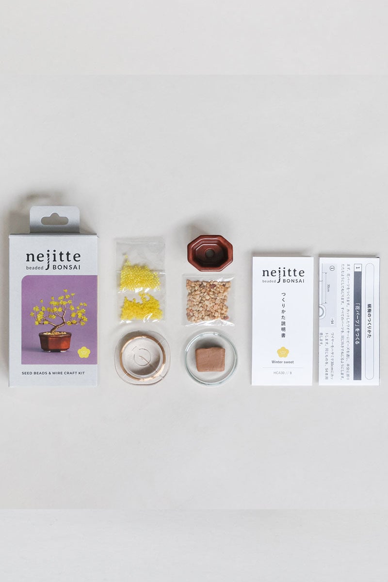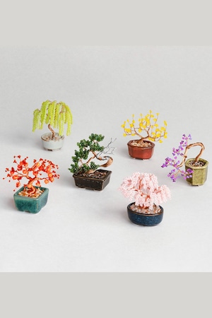 ビーズを通したワイヤーをねじって、小さな盆栽をつくるキット。